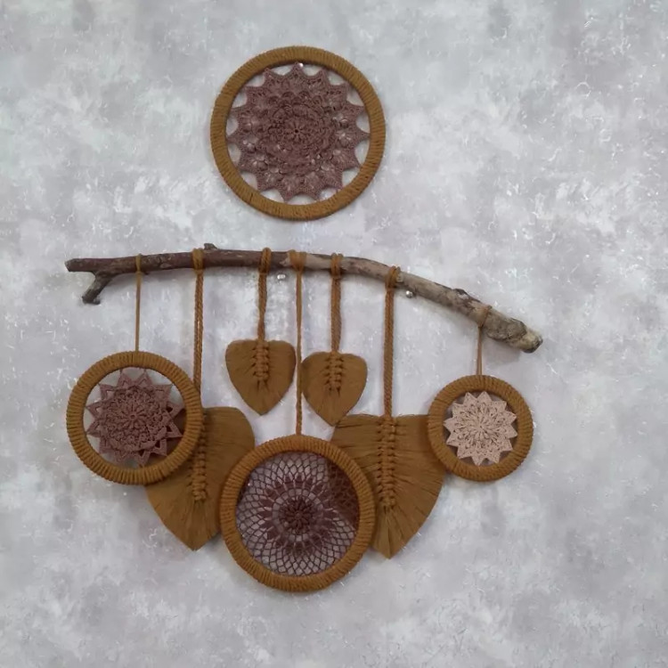 دیوارکوب و آویز دست بافت قلاب بافی ست 4 عددی به همراه برگ مکرومه