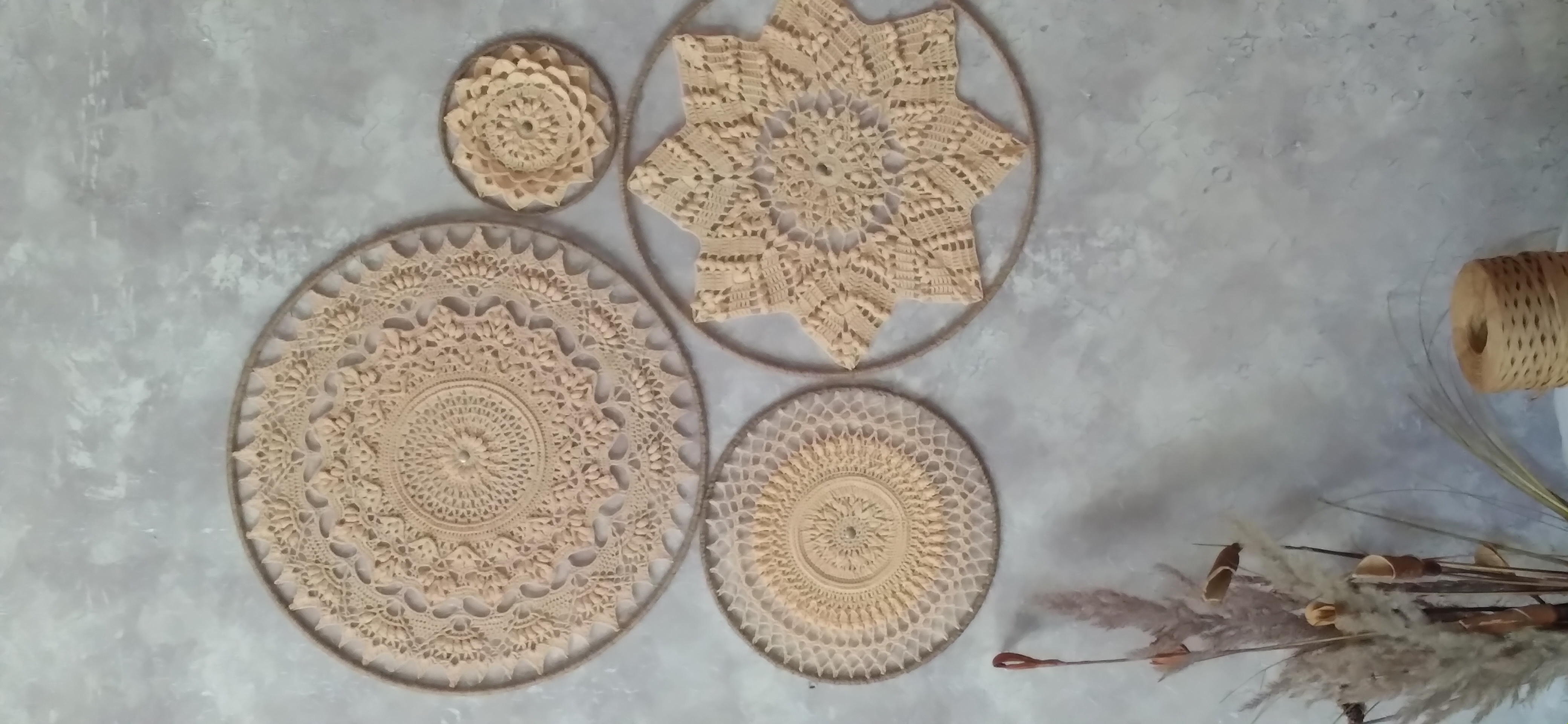 دیوارکوب و آویز دست بافت قلاب بافی ست 4 عددی به همراه برگ مکرومه (پس کرایه)